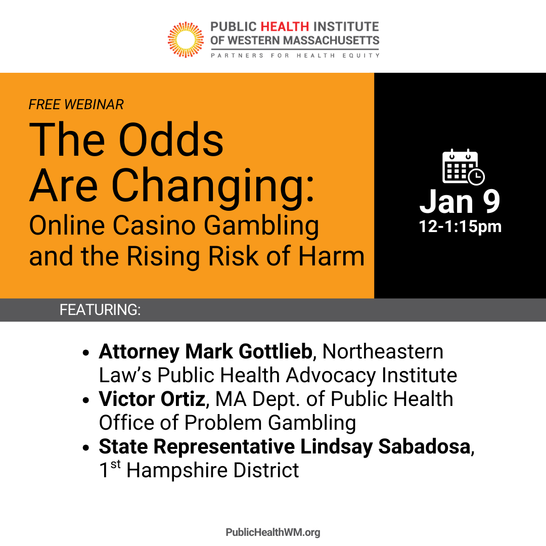 As Massachusetts considers legalizing internet casino gambling through H.4431, join us for a free webinar about what these changes could mean for public health and our communities. Speakers include Mark Gottlieb of Northeastern Law’s Public Health Advocacy Institute, Victor Ortiz from the MA Dept. of Public Health Office of Problem Gambling, and State Representative Lindsay Sabadosa. The discussion will be moderated by Jessica Collins of the Public Health Institute of Western Massachusetts, and attendees will have the opportunity to submit questions during a live Q&A.