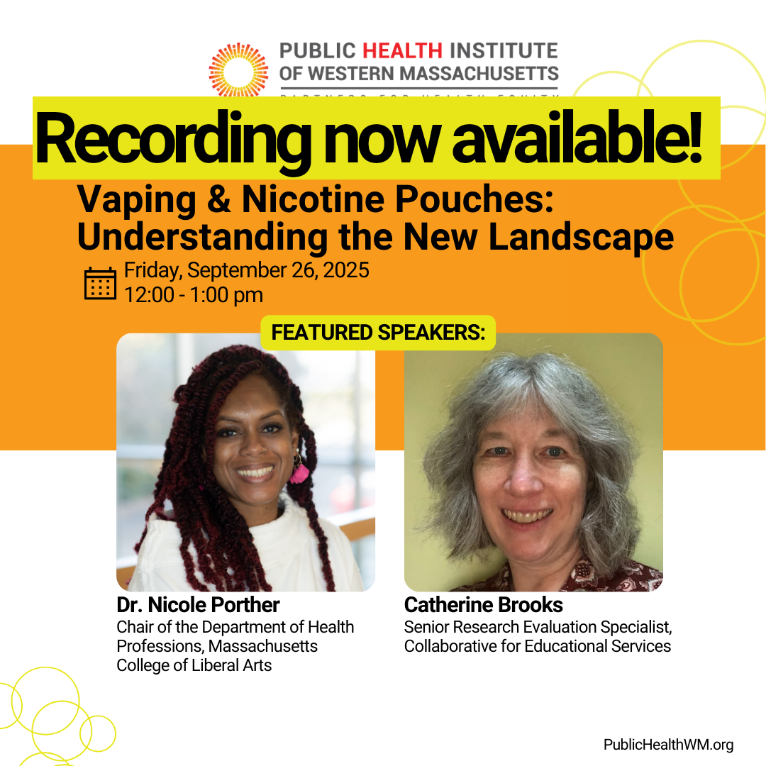 Vaping & Nicotine Pouches: Understanding the New Landscape Date: Friday, September 26, 2026 Time: 12:00 - 1:00 pm Join us for an informative webinar as we explore the evolving landscape of tobacco and nicotine use, with a special focus on vaping and nicotine pouches like Zyns. This session will offer a high-level overview of emerging products, usage trends, and potential mitigation strategies—especially relevant for youth, families, community-based organizations (CBOs), and municipalities. Featured Speakers: Dr. Nicole Porther, Chair of the Department of Health Professions, Massachusetts College of Liberal Arts Heather Warner, MPH, Hampshire Franklin Tobacco-Free Community Partnership Coordinator, Collaborative for Educational Services Moderator: Jessica Collins, Executive Director, Public Health Institute of Western MA